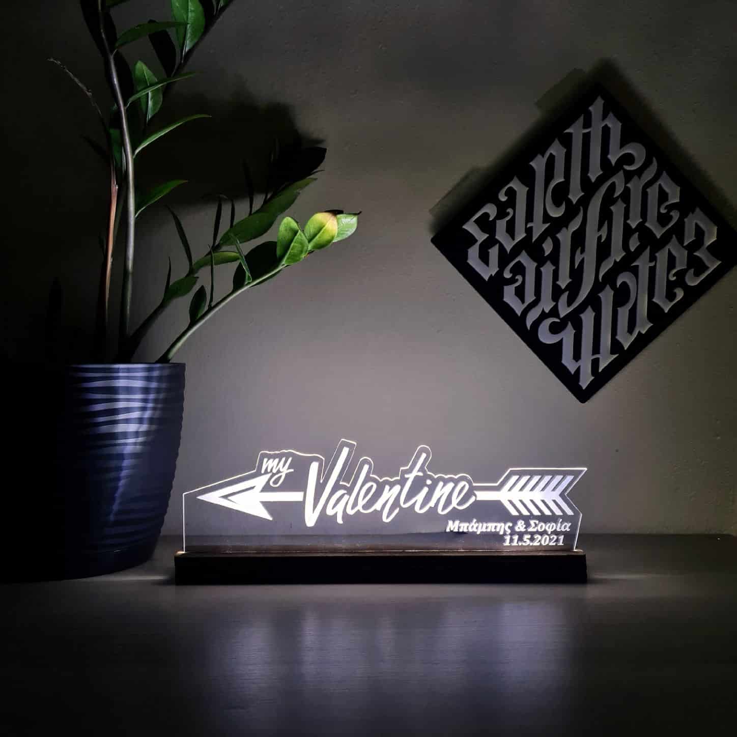 Πρόσθεσε ενα ιδαίτερο διακοσμητικό στον χώρο σου για μια ξεχωριστή ατμόσφαιρα.Το Led Lamp ‘My Valentine’ είναι μια εξ’ ολοκλήρου δική μας κατασκεύης , η οποία αποτελείται από διάφανο Plexiglass® με χάραξη του σχεδίου ‘My Valentine’ και την ξύλινη χειροποίητη βάση μας κρυφού φωτισμού. Το ‘My Valentine’ Led Lamp αποτελεί μία από τις δημοφιλέστερες επιλογές δώρου.